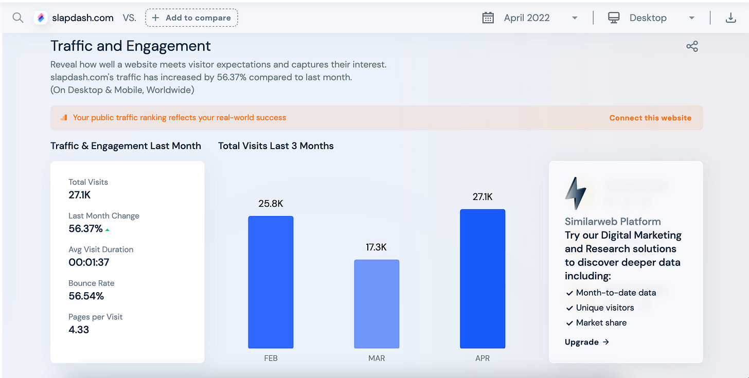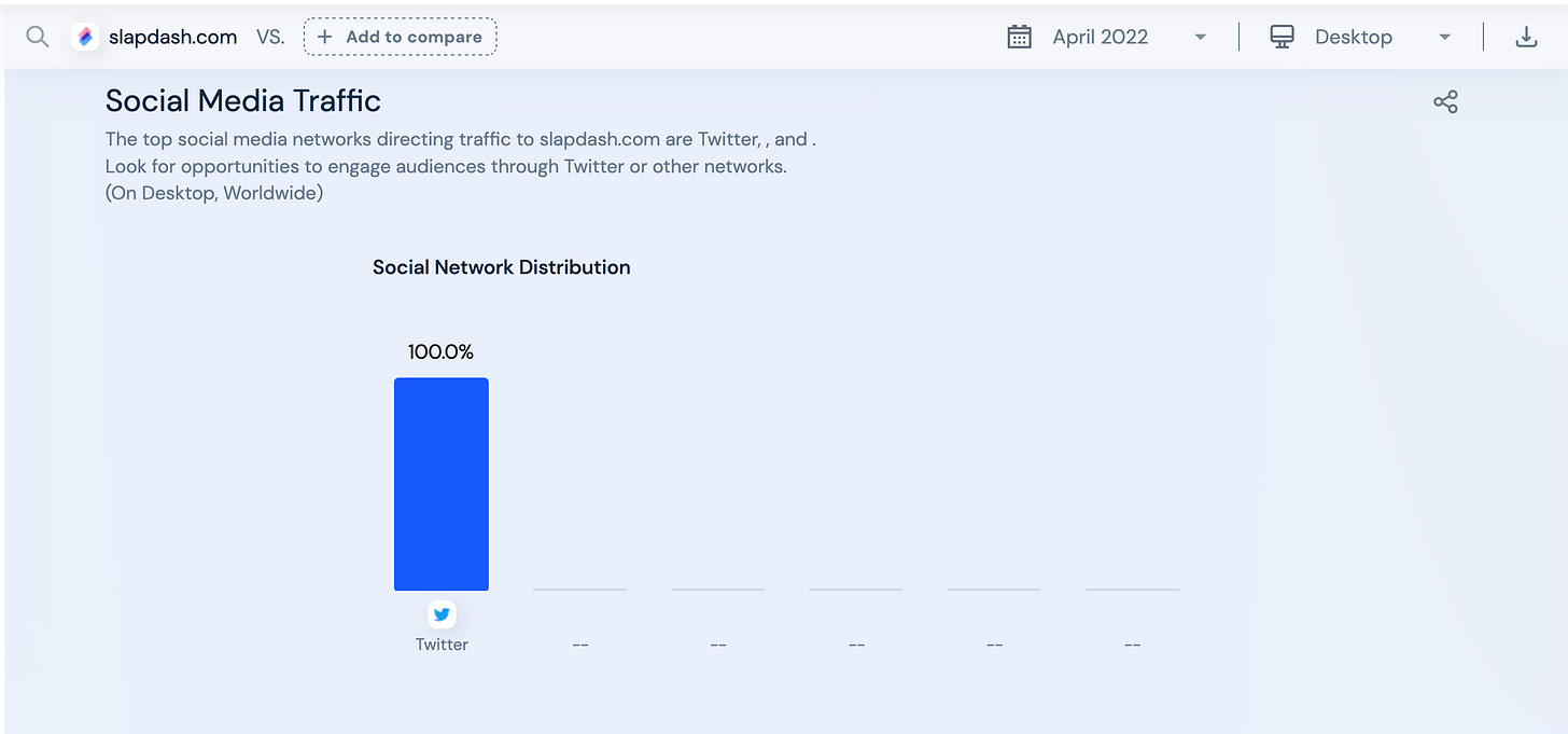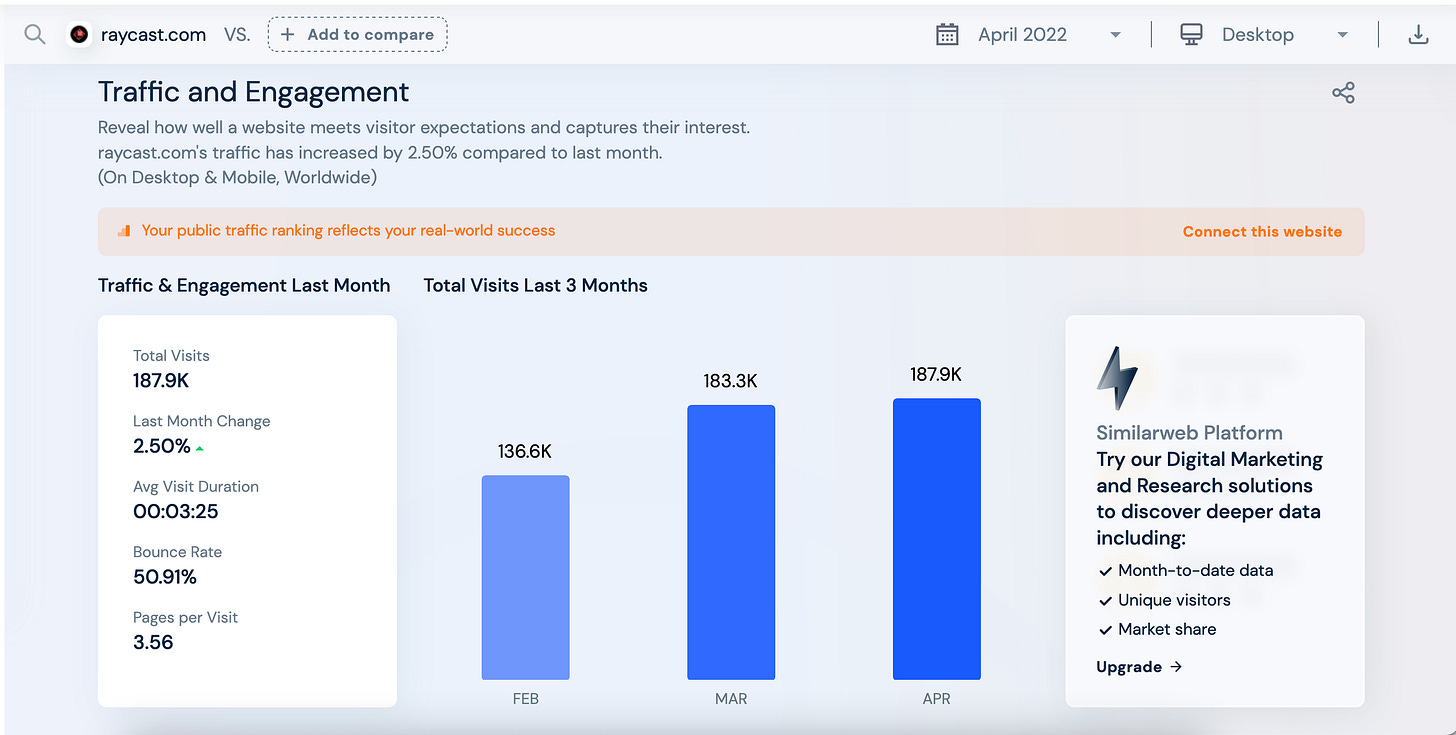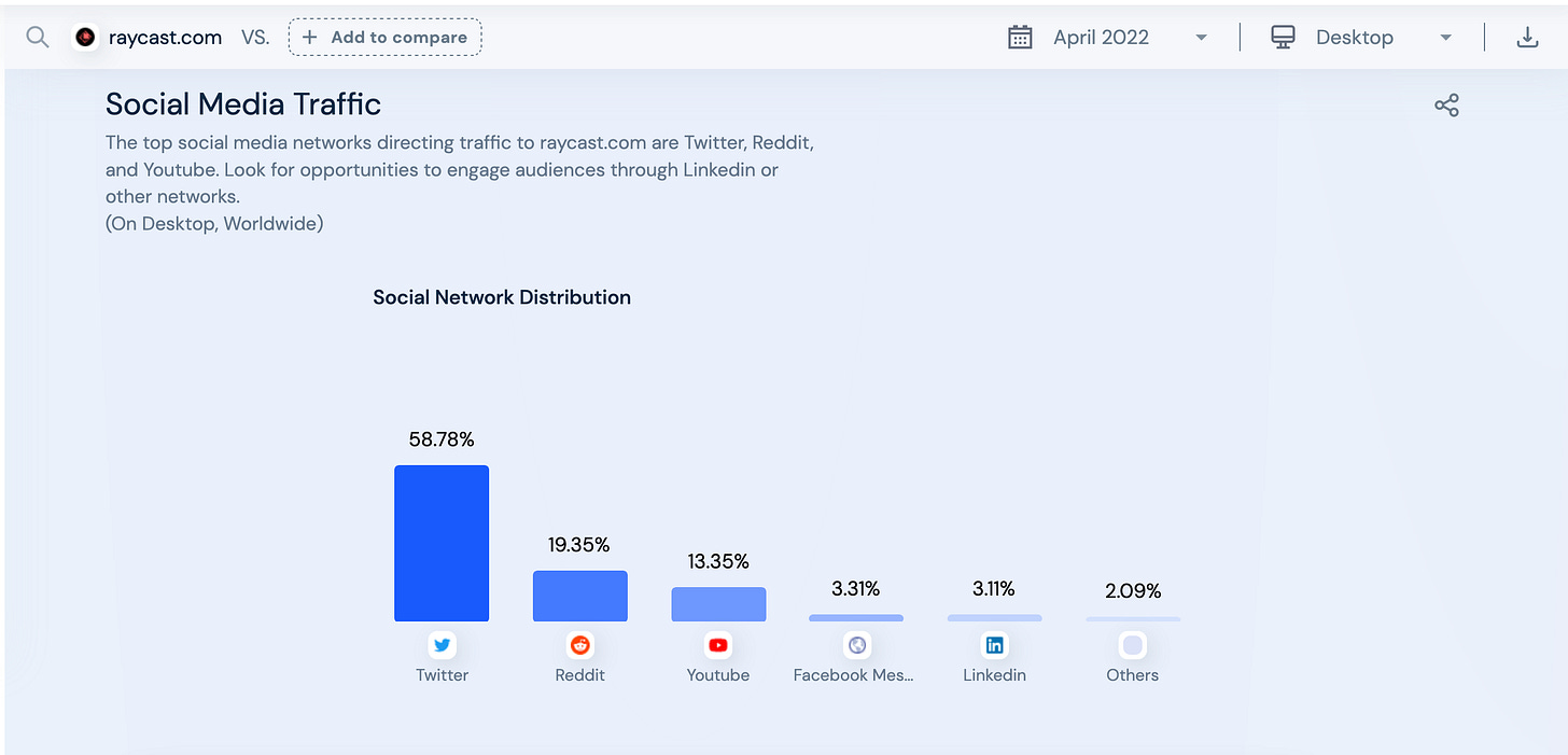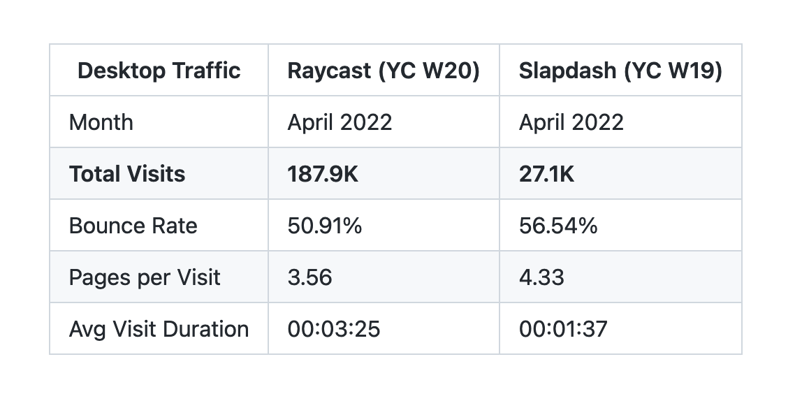 The Raycast website received an estimated 187.9K visits versus Slapdash’s 27.1K estimated visits for the month of April 2022. IOW, Raycast received nearly ~7x the amount of traffic received by the Slapdash website.