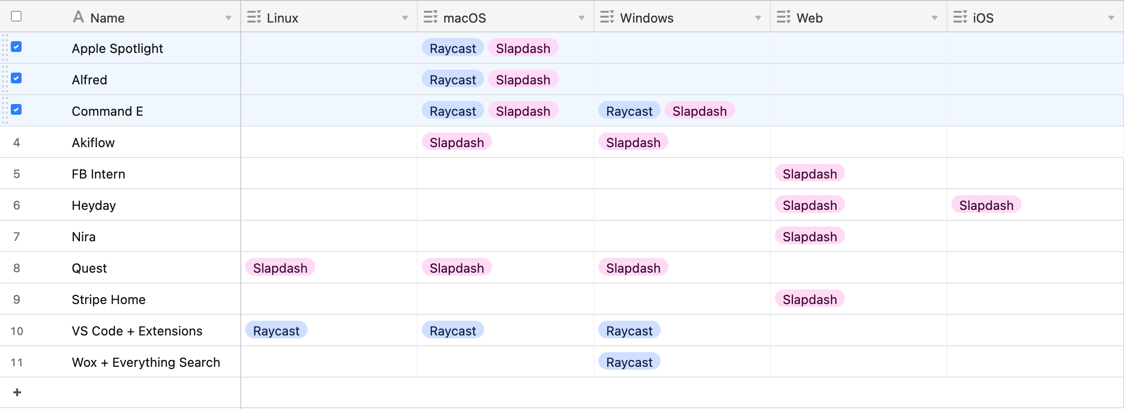 Looking at the spreadsheet, we see that Raycast and Slapdash both got compared with Apple Spotlight and Alfred, which are only available on macOS. They are perhaps the two best known apps in the app launcher/command bar category.