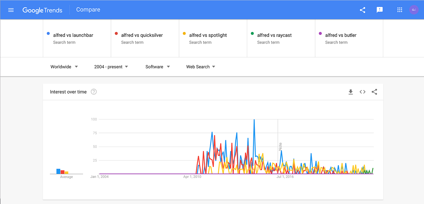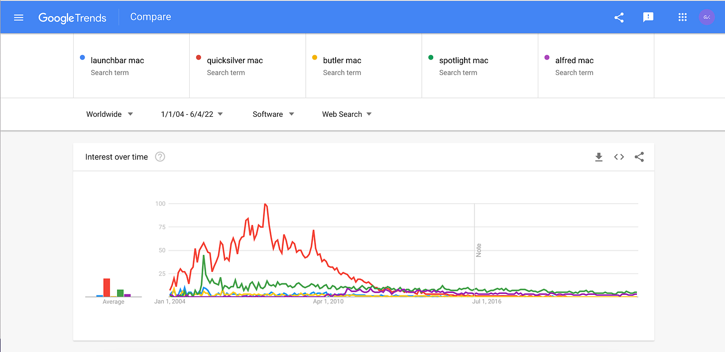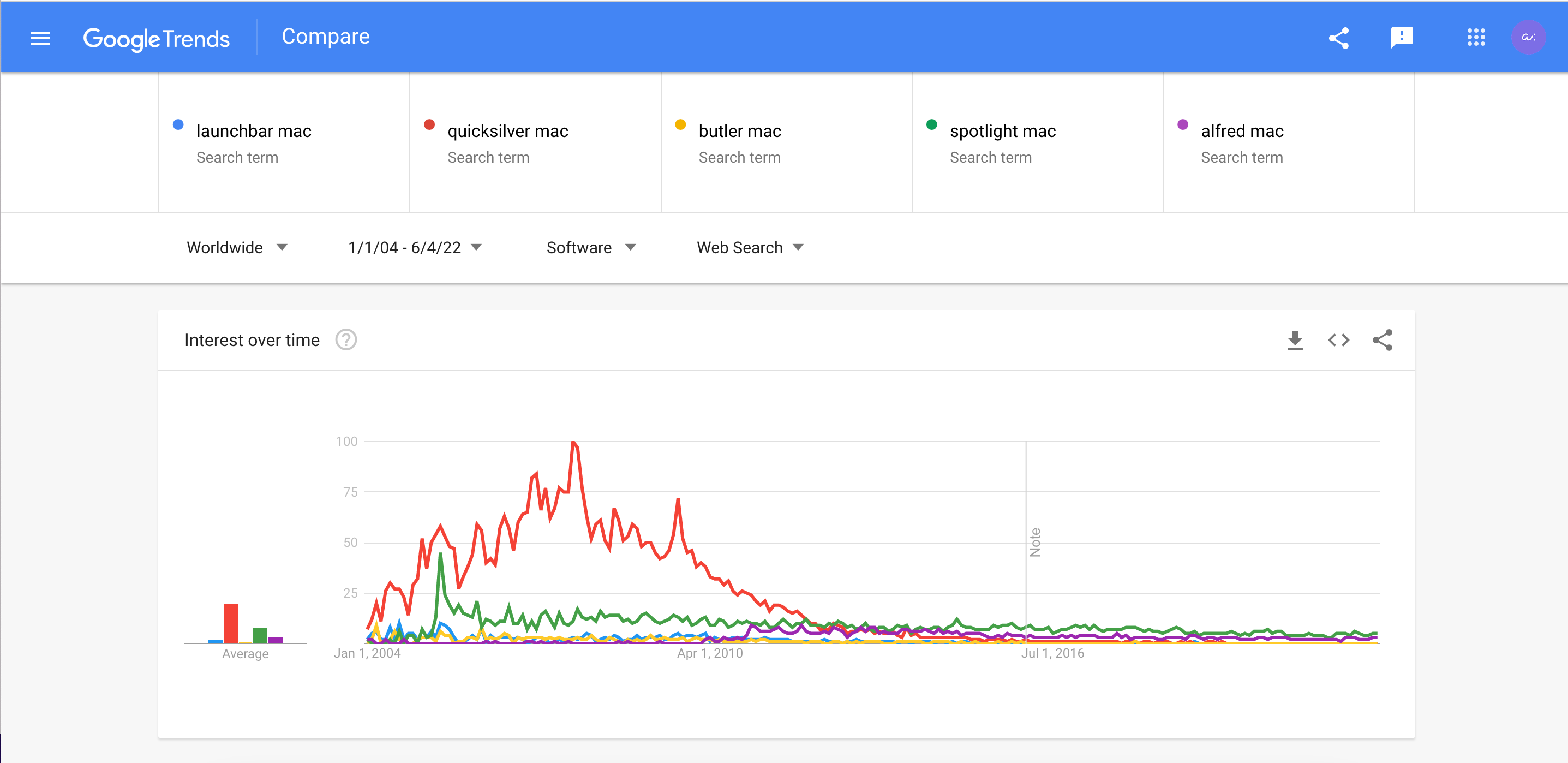 Its predecessors in this category are just a five (5): Apple Spotlight (2005) and four (4) by third-party vendors: LaunchBar (1996), Quicksilver (2003), Butler (200320) and Alfred (201021).