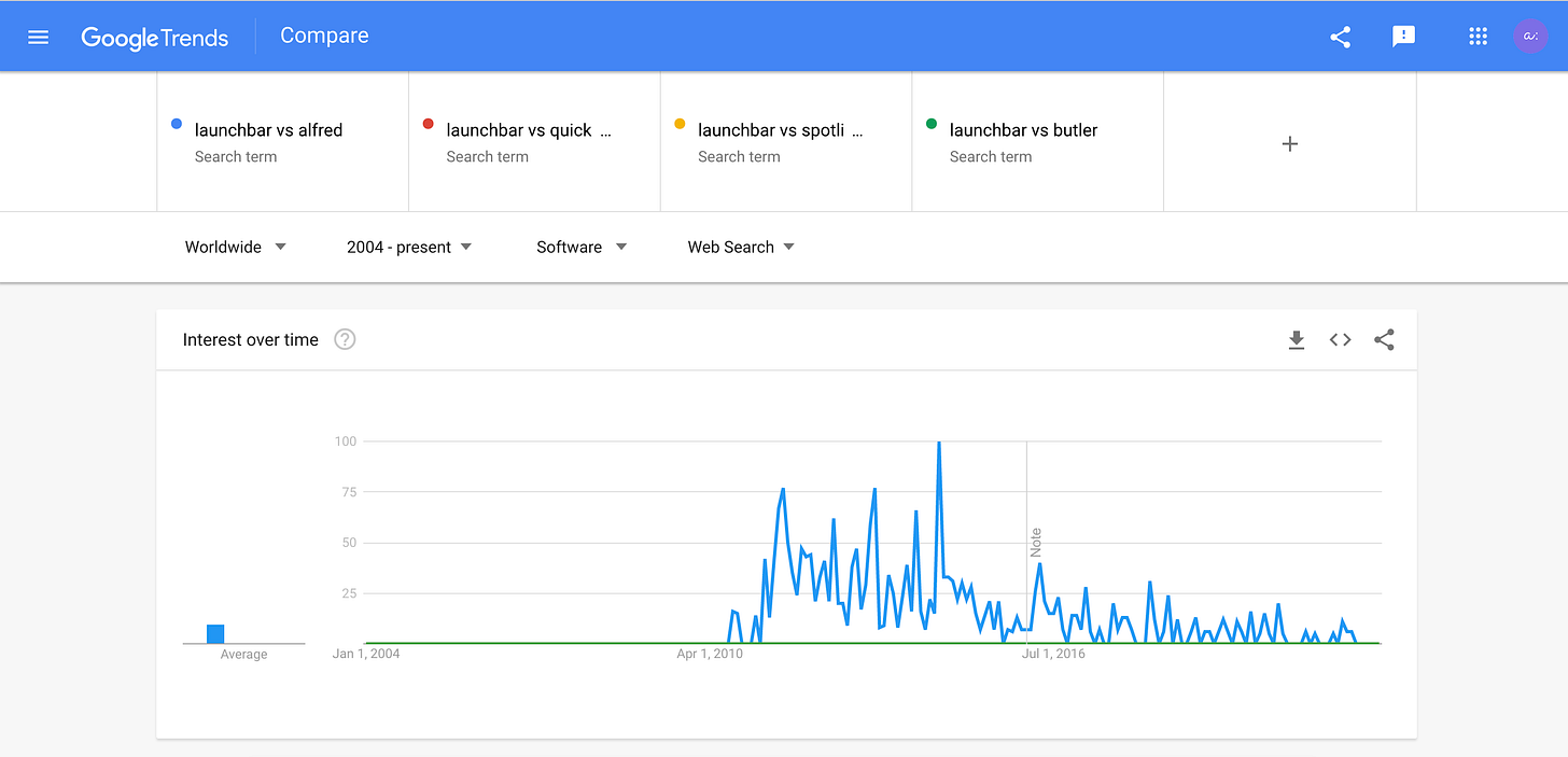 If we pick LaunchBar to be the category leader by virtue of being the oldest, then all four search queries should have returned results: