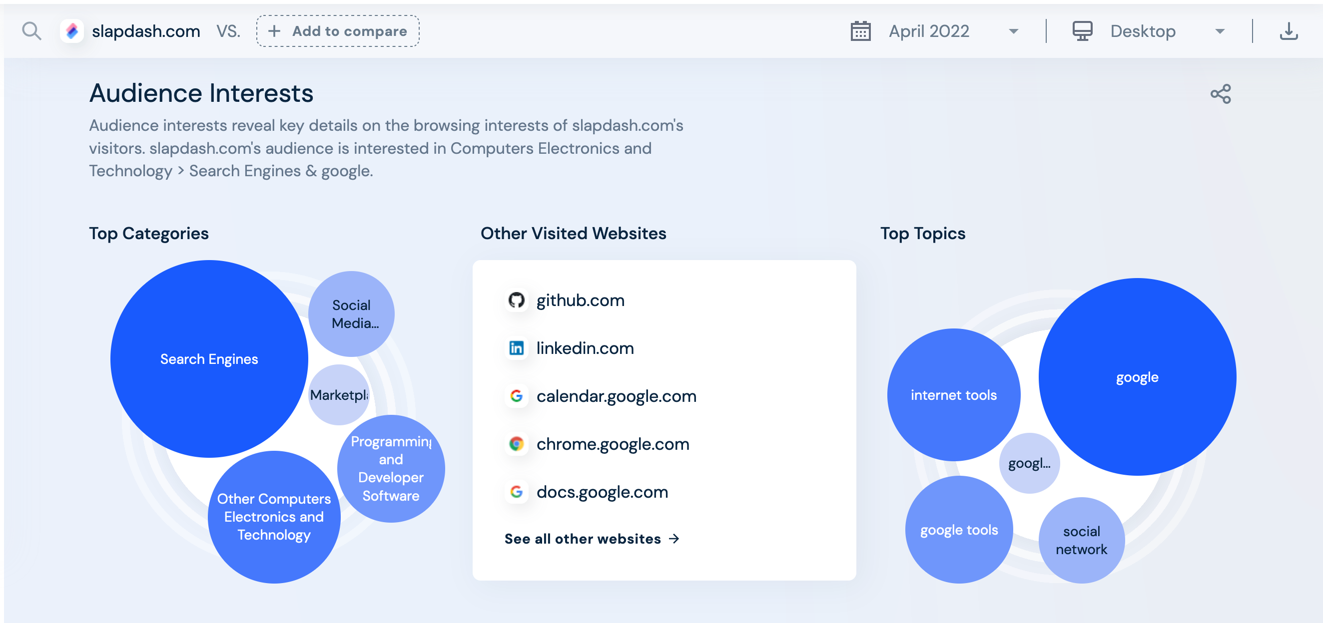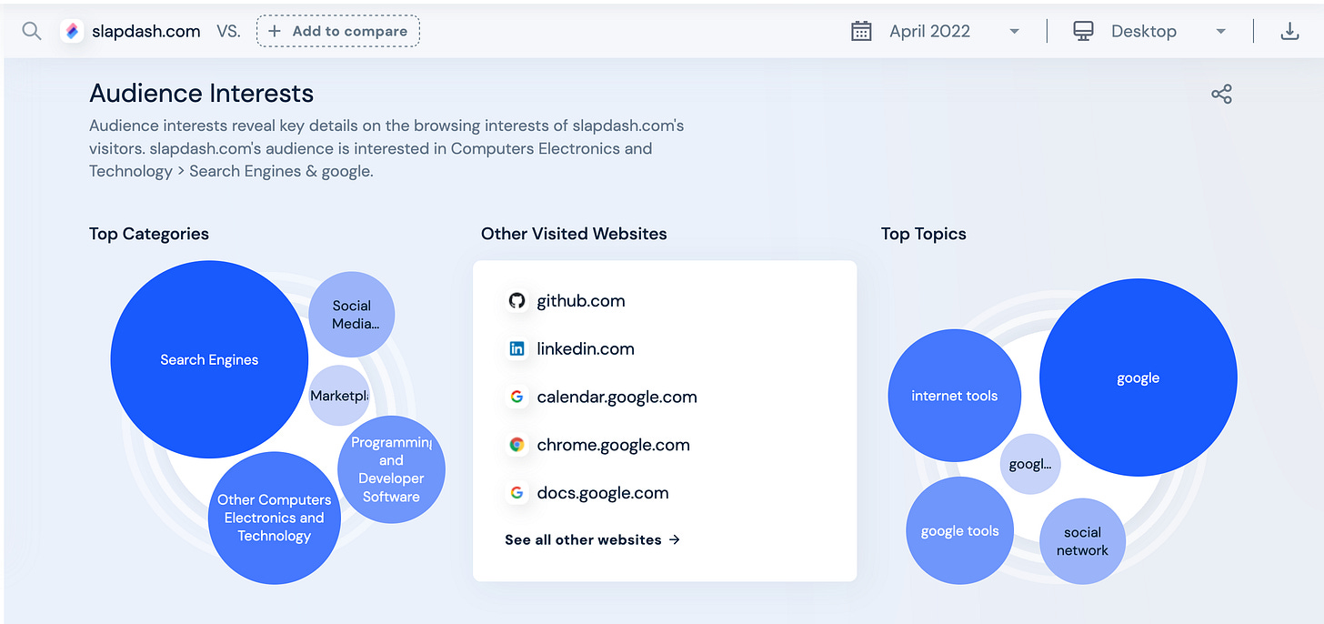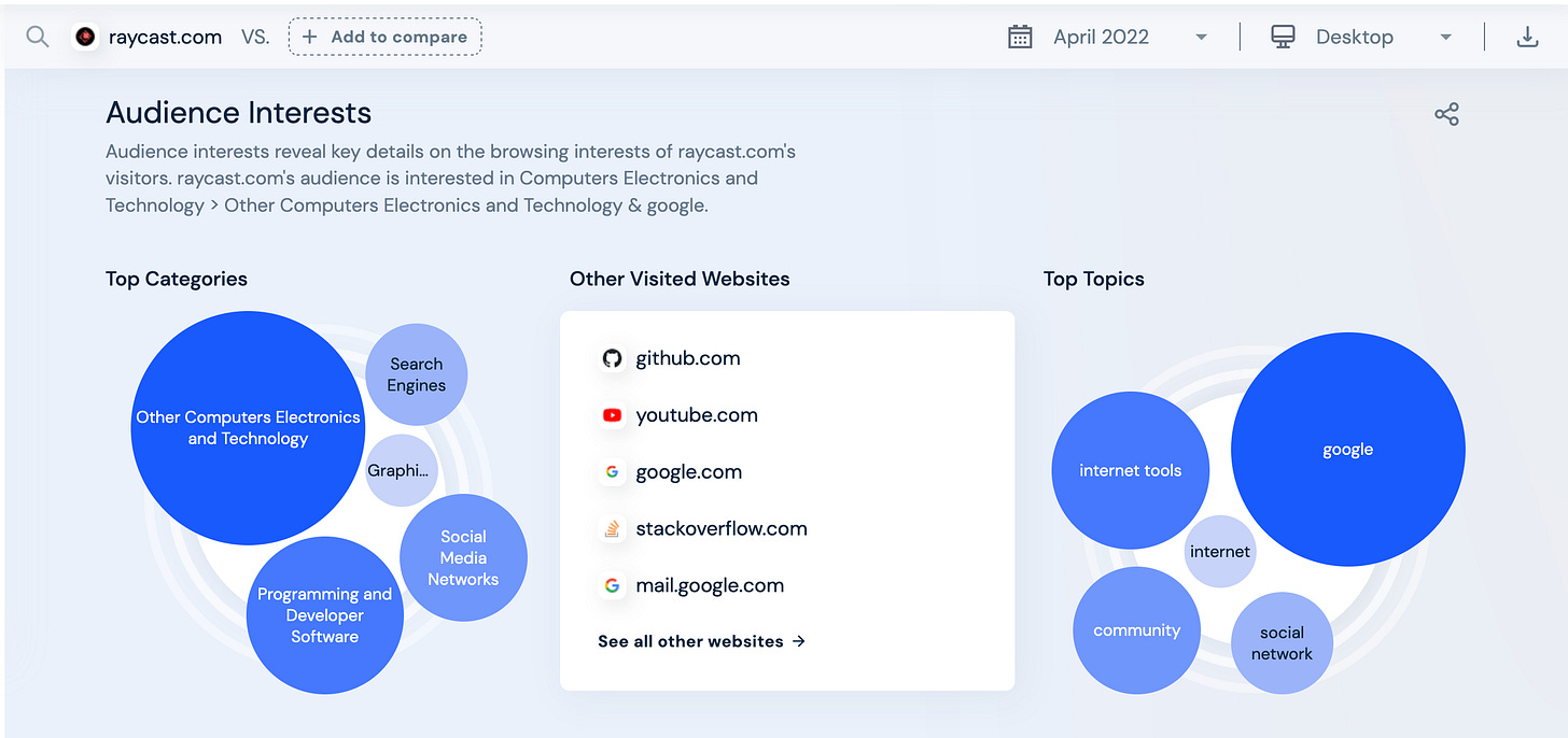 According to Audience Interests data from SimilarWeb’s traffic measurement product, Raycast and Slapdash both appeal to an audience with overlapping interests as can be seen in the screen shots below: